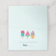 Place card with an illustration of 3 different ice cream treats. A blue-green popsicle with strawberry drippings and colorful sprinkles. A watermelon popsicle. A cone with layers of delicious ice cream in pink and mint. All with cute kawaii smiles.