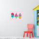 Poster with an illustration of 3 different ice cream treats. A blue-green popsicle with strawberry drippings and colorful sprinkles. A watermelon popsicle. A cone with layers of delicious ice cream in pink and mint. All with cute kawaii smiles.