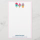 Stationery paper with an illustration of 3 different ice cream treats. A blue-green popsicle with strawberry drippings and colorful sprinkles. A watermelon popsicle. A cone with layers of delicious ice cream in pink and mint. All with cute kawaii smiles.
