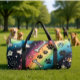 This colorful pattern duffle bag boasts a zany rainbow gradient background featuring various colored paw prints and playful bones with star accents. It's a cute design pet accessory and versatile travel gear, perfect for any pet lover.