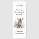 Thank your child's birthday guests with this cute personalized bookmark, picturing a zebra foal in a watercolor style, and the message 'Thank you for coming to my party'. Each bookmark can be personalized with the guest’s name for a unique touch. The back features a leafy wreath surrounding the recipient's initial, an inspiring quote to encourage young readers, and a picture of books to complete the theme. A thoughtful and practical party favor and keepsake.
