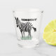 Add a name to create a personalized gift for animal lovers. This shotglass has a realistic style illustration of a zebra standing in some green grass with a name or other text in bold black lettering.