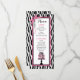 Zebra print background with 3D-look pink polka-dot bow and lace trim border and elegant chic two tiered cake menu card for small bakery business.