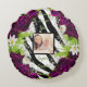 Beautiful, bold, and elegant round, cotton zebra print pillow fashioned with vivid violet purple roses, baby breaths, white crocus flowers and pops of green with gorgeous tropical palm fronds.