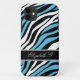 Stylish custom iPhone 5 case personalized with your name, and designed with a zebra print pattern with black, white, and blue zebra stripes.