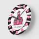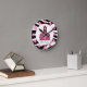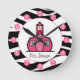 A clock featuring a zebra print design and the logo of The Pink Schoolhouse. Personalize with your name under schoolhouse. Clock features white numbers on pink dots.