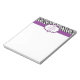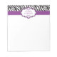 This notepad is all about being a girly girl. Zebra print makes a striking background for an ornate frame on a polka dot bright purple ribbon. A name or other message is showcased in the frame surrounded by curly ornaments. Available in alternate colors with matching products.