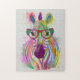This watercolor print features a colorful portrait of a zebra in orange glasses adorned in flowers | By Fab Funky. Image ID: 192221D