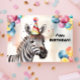 Embark on a wild celebration with this zebra birthday card, featuring a colorful illustrated zebra adorned with a party hat. A zebra-themed gift for enthusiasts of these majestic creatures. Perfect for zoo safari animal birthdays, the watercolor illustration adds a touch of vibrant charm to your birthday wishes.