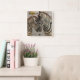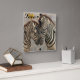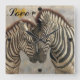 10.75” x 10.75” acrylic wall clock with an image of a painting of a zebra and her colt and an optional gold heart with “Love” printed across it in black script. Black orbs mark the 12, 3, 6, and 9 positions.