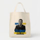 Honoring the fearless and charismatic President of Ukraine, Volodymyr Zelenskyy - this tote bag design features black and white photo cutout of the country's leader with blue and yellow "hope" "Hero" "Ukraine Strong" words.