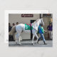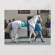 Zen Papa, a well built white-roan, 3 year old colt, going to the post at Aqueduct during a cold Winter day. Led by his groom and handler and ridden by jockey Irad Ortiz jr. wearing the green and white saddlecoth number 5. This gorgeous thoroughbred is built like a machine as he walks towards the paddock as his admirers look on.