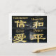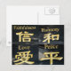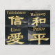 Zen design features words and Chinese symbols for faithfulness, harmony, love and peace.