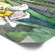 A botanical poster print featuring a scripture from the Bible book of Zephaniah 3:17 and decorated with blooming white daffodil flowers with yellow centers hand drawn with ink with a background of spring shades of green and yellow watercolor.