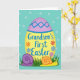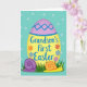 This card features a large golden oval in the center, trimmed with a lilac band in a zigzag pattern and finished with a thin blue edge. Across the middle of the oval, the message “Grandson’s First Easter” is written in flowing purple lettering, with small orange, blue, and purple flowers sprinkled around it 🌷. The background is a soft aqua field dotted with pale blue circles, giving the scene an airy spring-sky look. Along the bottom, bright green grass rises up and frames the main shape like a gentle garden border. Tucked into the grass are two cute snails that seem like friendly companions, leaning toward each other as if sharing a quiet moment. One snail is deep purple with a clear spiral shell, while the other is sunny yellow with an orange shell and tiny antennae 🐇. The purple snail sits to the left and the yellow snail rests to the right, both nestled at the base of the oval near the grass tips.