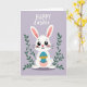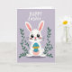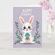This card shows a white bunny sitting upright on a soft lavender background, gazing forward with big dark eyes, a tiny pink nose, and a faint blush that gives it a sweet, friendly look 🐰. Its long ears rise high with pale pink inside, framing its face like a gentle hug. In its paws, the bunny holds an oval egg colored turquoise blue, decorated with a golden zigzag band and scattered white speckles, as if it’s a cherished gift being offered to someone special. On both sides, dark green leafy stems curve upward, creating a quiet garden frame that feels like two friends leaning in close 🌷. Near the top, the greeting reads “HAPPY Easter,” with “HAPPY” set in white uppercase letters and “Easter” in white cursive-style lettering just beneath it. The text sits centered above the bunny, leaving plenty of open space so the scene feels calm and airy. The egg’s turquoise stands out against the lavender field, while the green leaves add a grounded contrast around the bunny. Small white speckles dot the turquoise egg, and a single golden zigzag stripe runs across its middle.