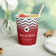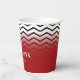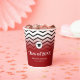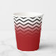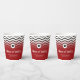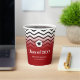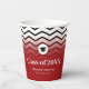 This graduation paper cup features classic black and white zigzags as the background accented with a dark red gradient color. This design is accented with a mortarboard above the text.