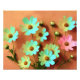 This vibrant botanical study celebrates the Zinnia elegans , rendered in a loose, expressive style that captures both natural beauty and artistic interpretation. Turquoise, buttercup yellow, and soft pink petals radiate from rich brown centers, contrasting boldly against a warm, earthy backdrop of terracotta and burnt sienna. The textured brushstrokes evoke a sense of movement, as if the flowers sway gently in a sunlit garden.