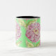 Zinnia pattern on a Coffee Mug. Start your morning with a burst of spring. Big, Bright Zinnia blossom in purple and green.