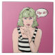 An art work inspired by vintage advertising poster of the sixties and seventies. A beautiful woman with green hair. She has her fingers to her lips. zip it up.