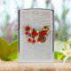 Red peacock eyed flower butterfly with red textured wing, decorated with composition of red, artistically painted roses with golden stems and leaves on white background.