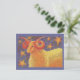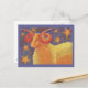 Aries the ram stands against a night sky filled with golden stars. Fire sign, March 21 - April 20 (there may be a variation in the dates). Postcard with a gold, orange, purple and blue customizable design on the front for you to personalise with your own text, images and ideas. An original coloured pencil and metallic ink drawing by Jess Perry.