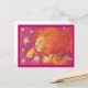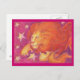 Leo the lion catches falling stars. Fire sign, July 24 - August 23 (there may be a variation in the dates). Postcard with a gold, orange, pink and purple customizable design for you to personalise with your own text, images and ideas. An original coloured pencil and metallic ink drawing by Jess Perry.