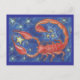 Scorpio, the scorpion, is surrounded by shining stars. Water sign, October 24 - November 22 (there may be a variation in the dates). Postcard with an orange, red, blue and yellow customizable design for you to personalise with your own text, images and ideas. An original coloured pencil and metallic ink drawing by Jess Perry.