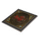 We are proud to offer this high quality ceramic tile featuring the fifth sign of the Zodiac: Sagittarius. This magnificent symbol is depicted with carved gold and embossed jeweled red lacquer against a leather background. The four suns struck in gold represent the totality of the seasons. At the center of each sun is the embedded Sagittarius birthstone: turquoise (depicted).