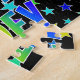 This fun, exciting, birthday-themed jigsaw puzzle design has the message "HAPPY BIRTHDAY, ZOEY" with the characters having a colorful rainbow spectrum inspired gradient pattern, along with a lively field of stars background pattern. An exciting puzzle like this might be used to send birthday greetings to somebody named Zoey. [~Z0000468]