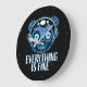 Vector cartoon illustration of a zombie astronaut with big eyes wearing a space helmet with a cracked glass shield in shades of blue with Everything Is Fine text. Tags: astronaut, cosmonaut, helmet, zombie, space, spaceman, monster, cadet, corpse, dead