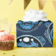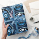 Vector cartoon illustration of a zombie astronaut with big eyes wearing a space helmet with a cracked glass shield in shades of blue. Tags: astronaut, cosmonaut, helmet, zombie, space, spaceman, monster, cadet, corpse, dead