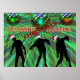 Three Christmas disco zombies wearing Santa hats and partying the night away beneath the colorful mirror disco balls with green, blue, and orange laser lights bouncing off the dance floor.