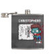 A personalized flask with a cool looking zombie, wearing ripped and tattered clothing with arms outstretched looking for brrraaaaiiins. Big vacant eyes with a sickly green rotting skin. Blood splatters behind his head. Personalize with your name. Text says Zombie Hunter Brew.