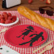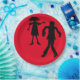 Zombie party paper plates. Bright red color with two walking zombie images in black. Fun for birthdays with a horror theme, or for Halloween.