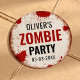 Vintage look round sticker for a zombie outbreak-themed party, with a weathered sign and blood stains.