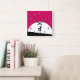 A clock with a cool zombie creature. Pink and black bold vibrant color scheme. A zombie silhouette with arms outstretched on the hunt for brains. A big white moon illuminates from behind. Art deco style clock numbers.