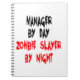 This text design featuring the quote "Manager by Day Zombie Slayer by Night" in blood red writing is perfect for any manager that loves zombies.