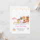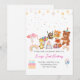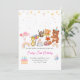 First birthday invitation with zoo animals carrying birthday balloons, cake and presents. Customise the card with the toddler's name and venue details.