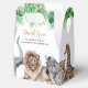 Wild zoo thank you party favor boxes featuring cute watercolor safari animals (giraffe, elephant, lion, zebra, leopard, monkey, bee eater bird), palm tree leaves, and a thank you template that is easy to customize.